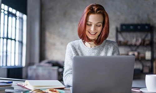 Eine Frau trinkt Kaffee, während sie einen Laptop benutzt.