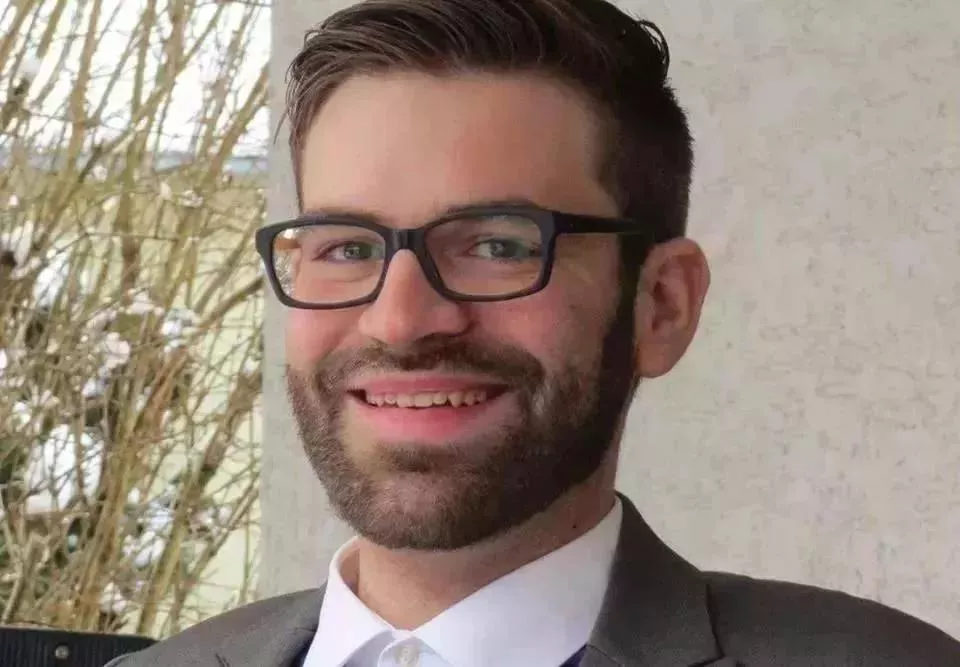 Frank Tassone mit lila Poloshirt und blauer Brille