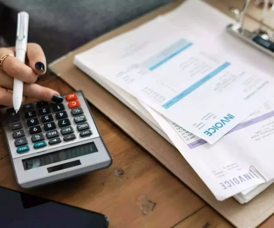 Eine Frau benutzt einen Taschenrechner auf einem Schreibtisch.