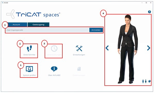 Sie können jederzeit ihr System prüfen (Markierung 1 im Screenshot unten) sowie das „erste Schritte Tutorial“ (Markierung 2 im Screenshot unten) absolvieren, um sich mit der Umgebung der virtuellen Welt vertraut zu machen. Die Anmeldung zur Veranstaltung via Gastzugang (Markierung 3 im Screenshot unten) ist jedoch erst kurz vor Veranstaltungsbeginn möglich, dann wählen Sie auch Ihren Avatar (Markierung 4 im Screenshot) und treten mit diesem der für Sie gebuchten Veranstaltung (Markierung 5 im Screenshot) bei.